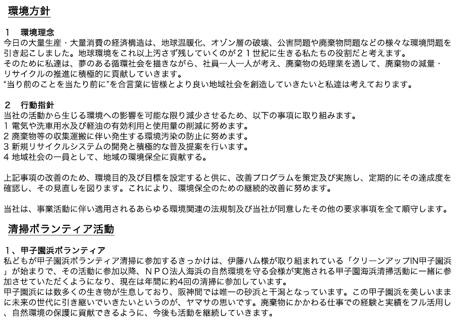 ヤマサ環境エンジニアリングは様々な廃棄物や清掃業務を取り扱う会社です。 捨てる事・リサイクルする事、当社が接する様々な角度から地域の環境問題を考え取り組んで行きたいと考えています。