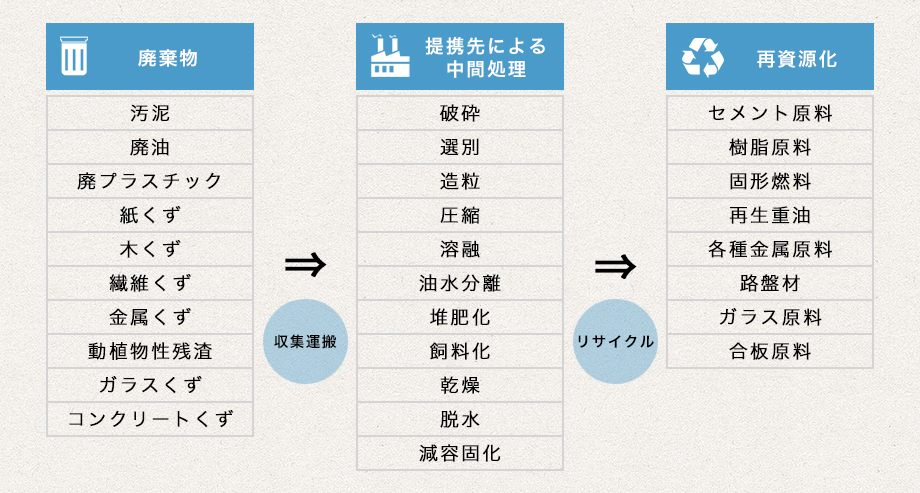 ヤマサグループでは創業の昭和38年以来、培ってきた廃棄物処理に関する経験やノウハウと、約50社の業務提携先というネットワークを活用した、企業様にとってベストなリサイクルプランの提案を行います。現代では、企業さまに求められる環境への取り組みはより高度なものになっています。中でも、廃棄物処理に関して、適正処理はもちろんのこと、廃棄物の減量化やリサイクル率の向上にも努めなければなりません。